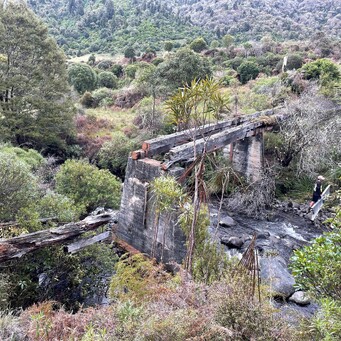 The trail gently ascends through the forest, crossing small bridges and weaving through the ngahere. You’ll briefly join the Mangawhero Forest Walk (share with care) before navigating across the road to rejoin a well-preserved section of the Bennett and Punch Tramway. This part of the trail travels through dense bush to a new bridge built upon the original piles of a historic multi-span bridge.